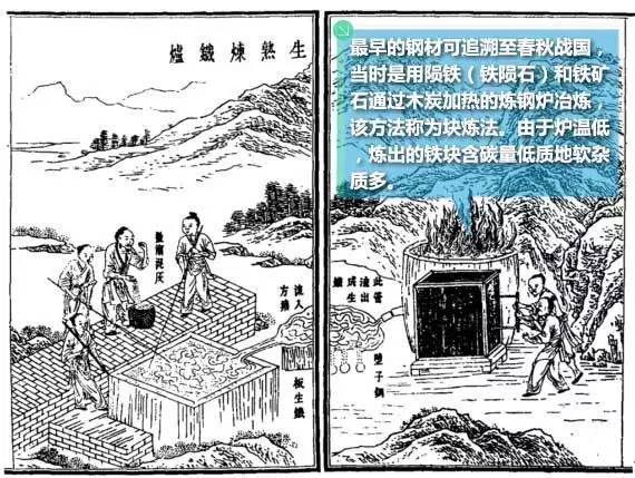 说起钢的历史,最早可以追溯到春秋战国时期。当时的主流金属材料是青铜,这一点毋庸置疑。但是青铜无论是作为工具还是武器都存在“脆”的问题,为了找到更好的替代材料,当时的人们开发了早期的冶铁技术。春秋战国时期的冶铁技术被称为“块炼法”,是因为炼出的铁呈块状,而且很软。此时的铁器相比青铜器没有太大的技术优势。