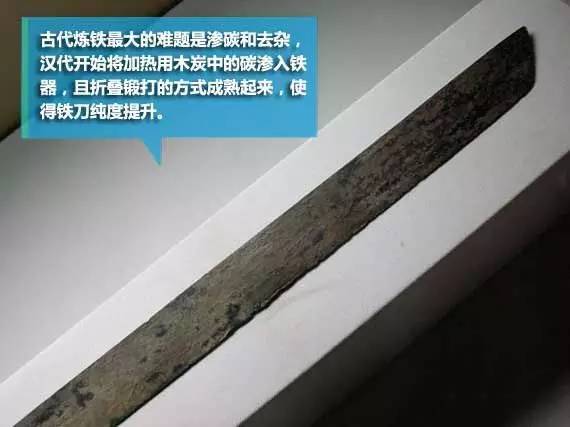 到了汉代,冶炼技术得到改进,风箱的升级使得冶铁炉的炉温升高,并且人们意识到碳对于铁硬度的影响,开始出现渗碳技术。汉代的冶炼方法被称为“炒钢法”,是因为炼钢时搅拌锅中铁水并加入合金元素的过程类似于炒菜。另外,为了排除杂质,折叠锻打技法也趋于成熟。优质的铁首先用来制作兵器,于是在很多汉代墓葬中出土了铁质兵器。