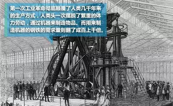 人类对于钢铁需求量的第一次飞跃是第一次工业革命时期。蒸汽机的发明使得人类第一次摆脱了繁重的体力劳动和依赖畜力进行的生产,燃料驱动的机器将人类的生产效率提高了几个等级。