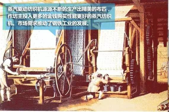 英国的纺织厂依赖于钢铁制造的蒸汽机和织布机