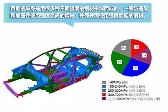 因此,在看厂商宣传资料时看到“我们的车身采用了1000Mp级别高强度钢制造”这种宣传语时不要误以为全车都是用这种钢造的,实际上可能只有四门防撞梁那几根杆达到了这个强度级别。