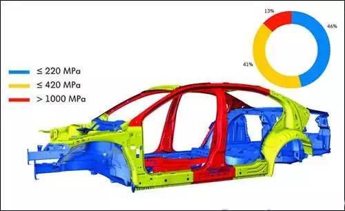 通过公布的车身强度图来看,其实最高强度的钢用量并不多,只是用在了防撞梁和一些加强部位上,车身大部分结构钢的强度并不高。这是以受力情况不同为根据的设计,,毕竟高强度钢的价格不菲,而且不易加工。