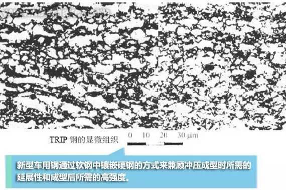 为了根本上解决高强度钢的冲压问题,一种新型钢材正在被应用于汽车车身的生产。这种钢材的基质是比较柔软韧性好的铁素体,其中镶嵌了硬度好的马氏体。在冲压时比较容易成型,成型后的材料又具有相当的强度。