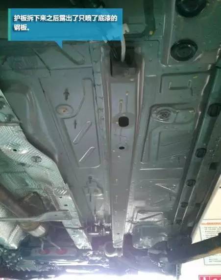 一些比较讲究的厂家会给底盘装上塑料护板,这些护板既能隔绝砂石撞击底盘钢板又能起到整理底盘气流的作用。而这些塑料护板下面也是只有一层底漆的底盘钢板。